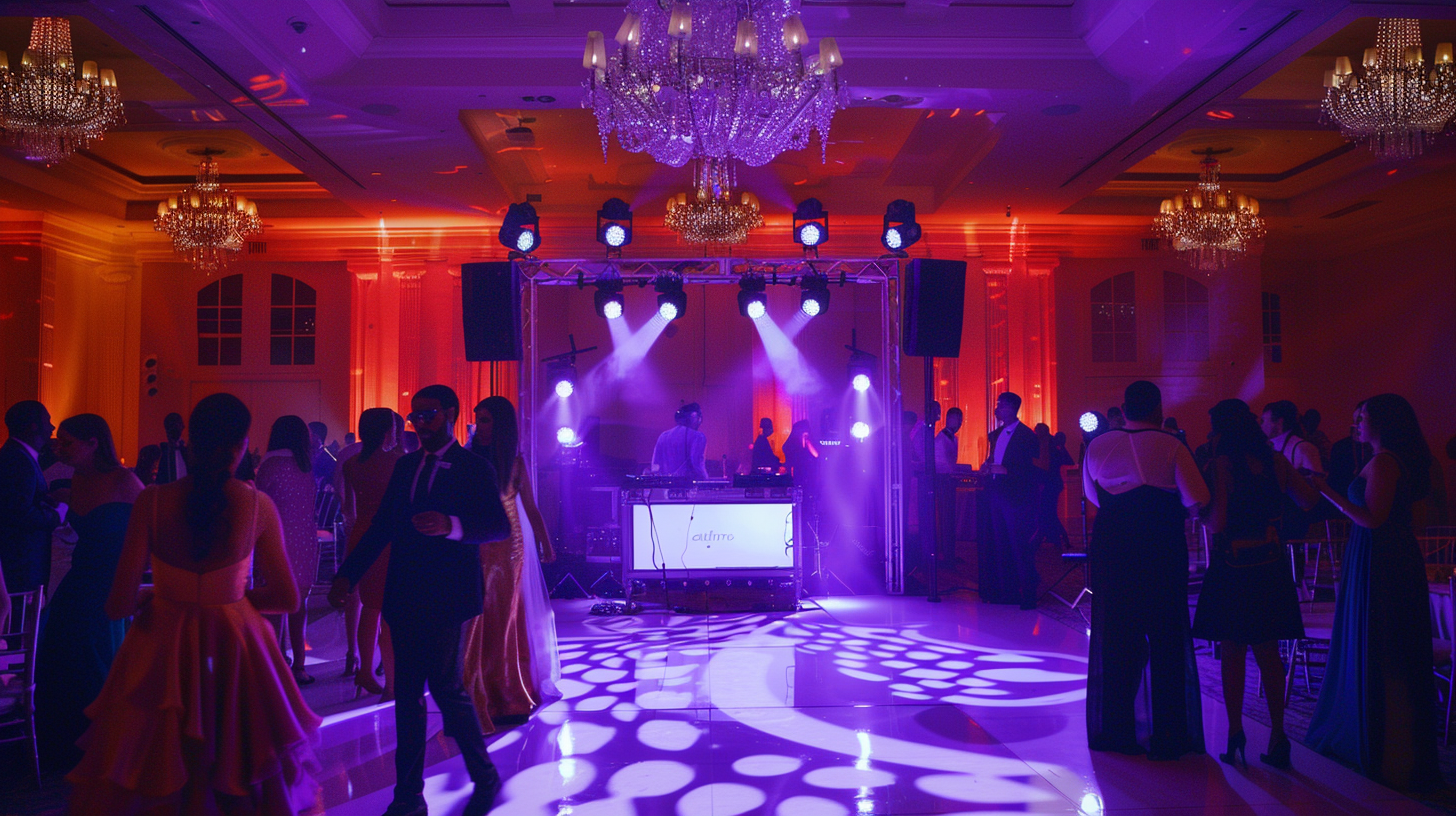 Transformamos su venue. Nuestra iluminación de diseño es una logística de precisión que utiliza luces LED y efectos para crear contrastes y ambientes de lujo, realzando la decoración y el estilo de su montaje profesional.